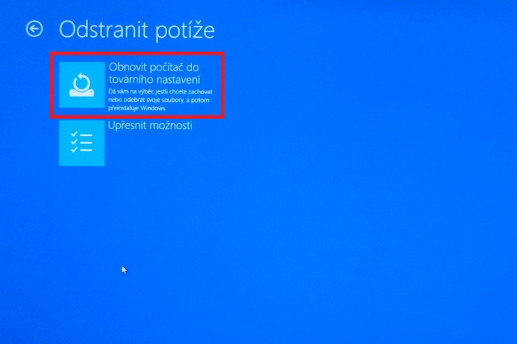 Zde máte na výběr, zda provedete pouze částečné obnovení do továrního nastavení nebo úplné. Pokud nemáte v počítači žádné důležité soubory, vyberte volbu Odebrat vše.