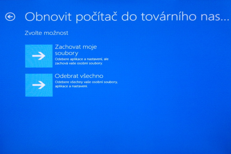 POZOR - pokud vyberete volbu - "odebrat všechno", aplikace i osobní soubory budou odstraněny. Pokud tedy máte v počítači na systémovém disku nějaké data (dokumenty, fotografie, ...), tak o ně přijdete.