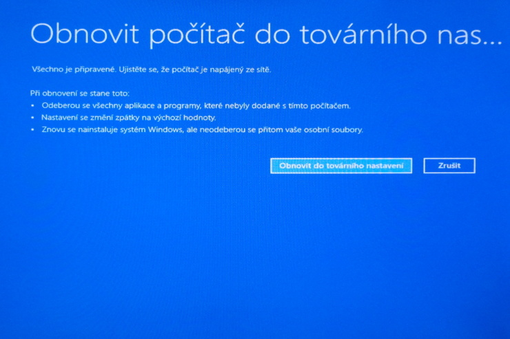 Obnovení bude trvat delší dobu (cca 1h). Pokud je vaším zařízením notebook, připojte jej k napájecímu adaptéru. Obnovení spustíte kliknutím na tlačítko: Obnovit do továrního nastavení.